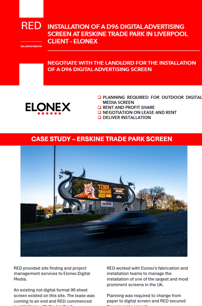 Elonex Digital Media approached RED to manage the installation of a new digital advertising screen at Erskine Trade Park in Liverpool. The project involved replacing an existing non-digital 96-sheet format with a state-of-the-art digital screen, one of the largest and most prominent in the UK.